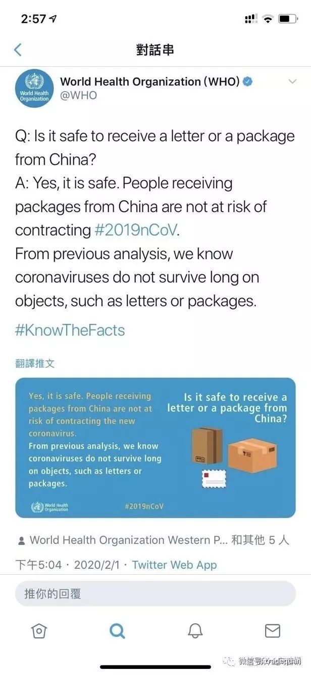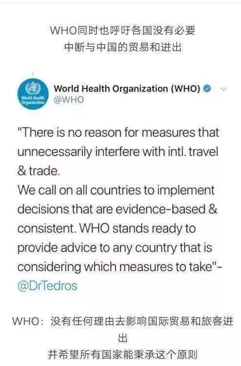 先看世卫组织再次发声,声称:不建议任何措施干涉贸易。来自中国的信件、包裹、货物很安全!