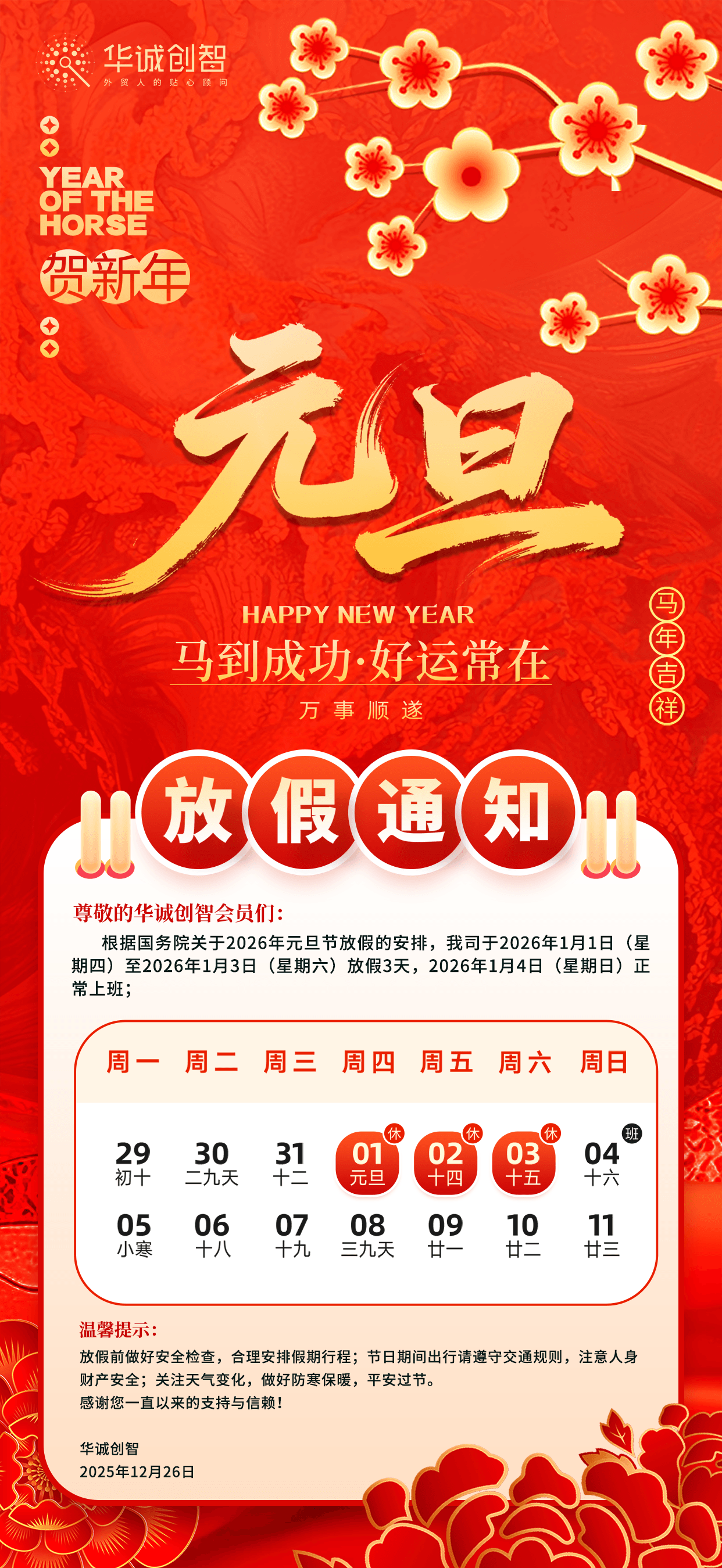尊敬的华诚创智会员们:根据国务院关于2026年元旦节放假的安排,我司于2026年1月1日(星期三)至2026年1月3日(星期五)放假3天,2026年1月4日(星期六)正常上班;